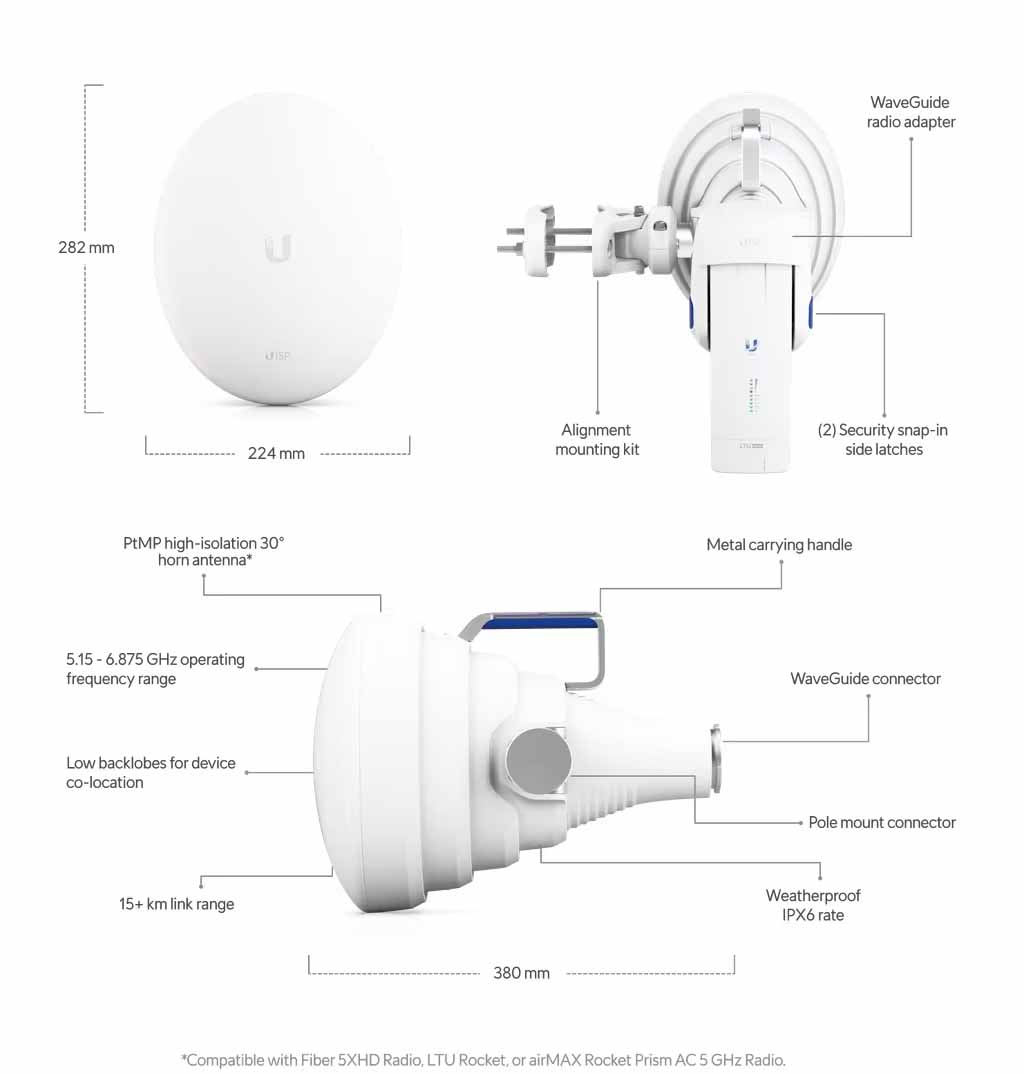 The Ubiquiti UISP Horn is a high-isolation PtMP horn antenna operating in the wide 5.15–6.875 GHz band. With a narrow beam (30°) and exceptionally high F/B ratio (up to 50 dB), it effectively eliminates interference in dense mast installations, ensuring stable transmission in challenging environments (IPX6).