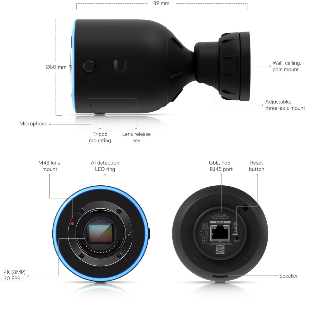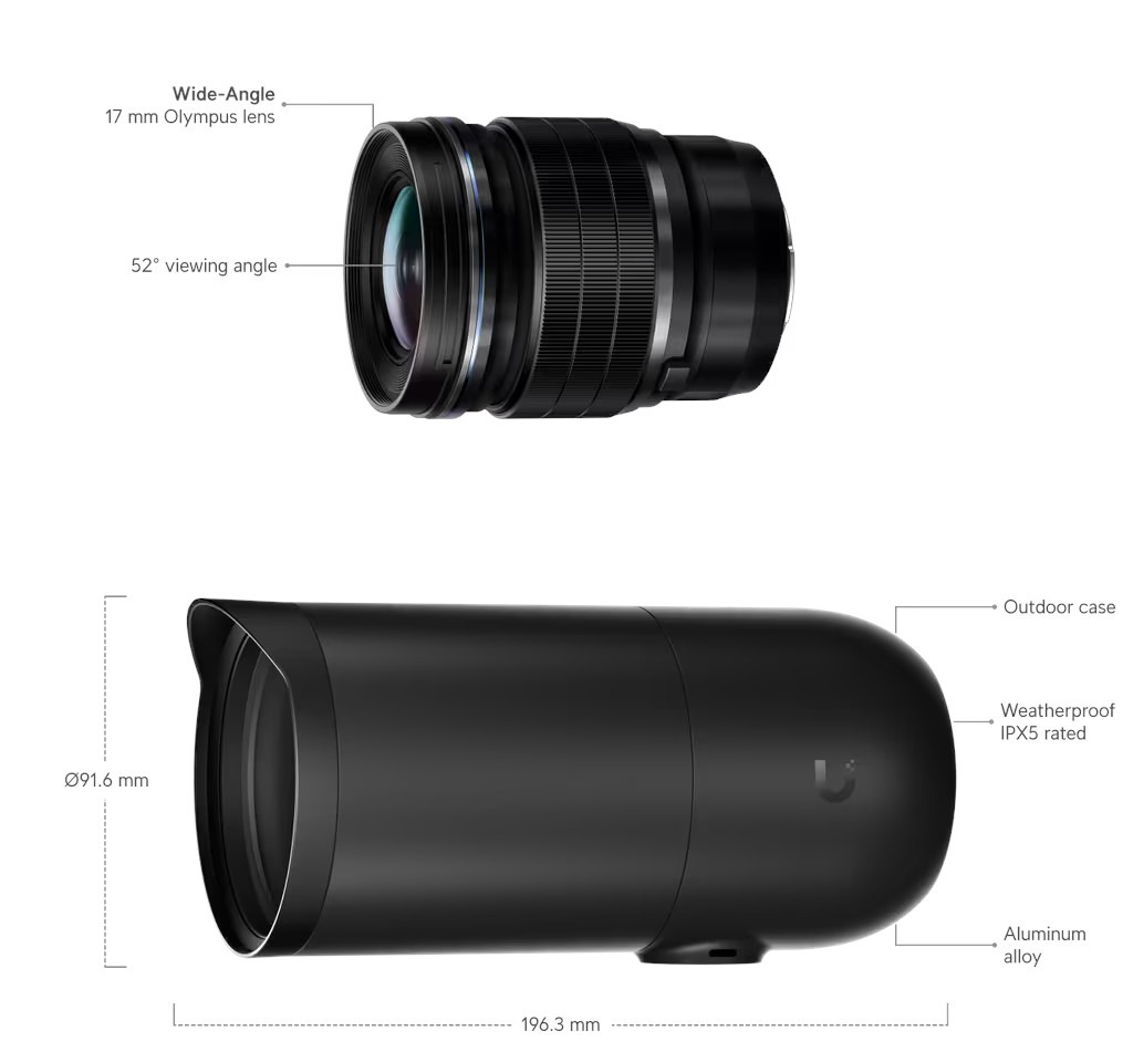 Ubiquiti AI DSLR is a camera for indoor and outdoor surveillance, offering exceptional image quality and impressive performance in low light conditions. What sets this model apart from standard devices is the use of a 4/3" CMOS sensor (10MP) and compatibility with professional, interchangeable M. Zuiko Digital ED PRO photographic lenses (choice of bright 17mm ƒ/1.2 or 45mm ƒ/1.2 lenses). The camera records in 4K resolution (8MP, 3840 x 2160 in 16:9 aspect ratio) at a smooth 30 frames per second.