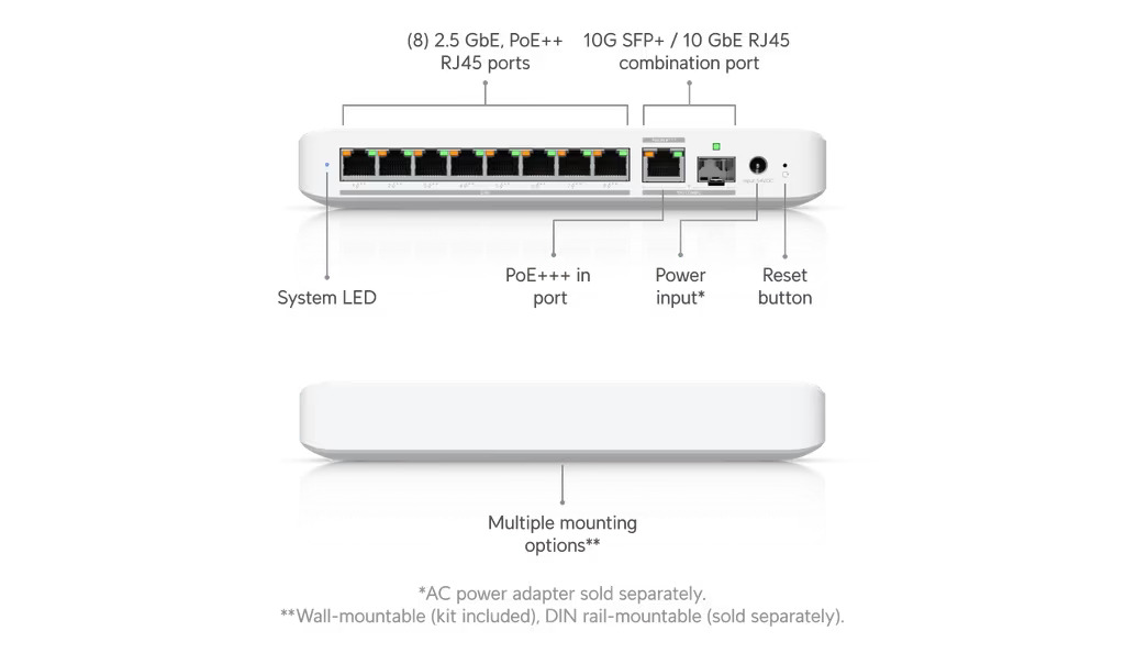 | Układ portów | 2.5 GbE RJ45: 8 (wszystkie PoE++) (2.5G/1G/100M/10M) 10 GbE RJ45: 1 (PoE+++) (10G/5G/2.5G/1G/100M) 10G SFP+: 1 (10G/1G) |